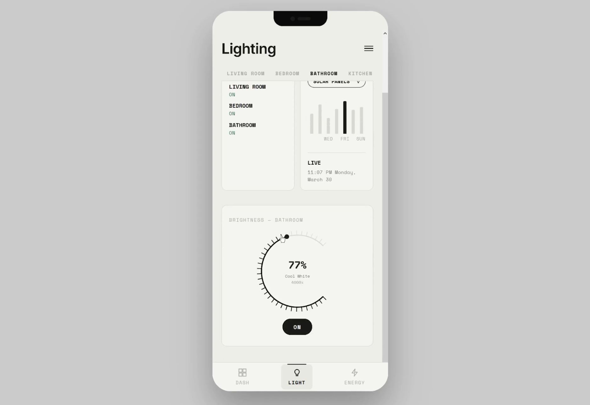 Every animation in the prototype is functional, not decorative. The temperature chart scrolls a 60-point rolling window updated every two seconds — the line doesn't replay an entrance animation on each tick, it simply extends, giving the sensation of a live instrument. Number transitions use Framer Motion's spring physics so metric card values ease toward new readings rather than snapping, preserving the sense of a continuous signal rather than a discrete update. The circular dimmer on the lighting screen uses SVG geometry and pointer event tracking to render a draggable arc that updates brightness in real time. The add-sensor sheet springs up from the bottom with a spring easing that matches the physical weight of a bottom drawer. None of these are gratuitous — each motion is doing the work of communicating system state.