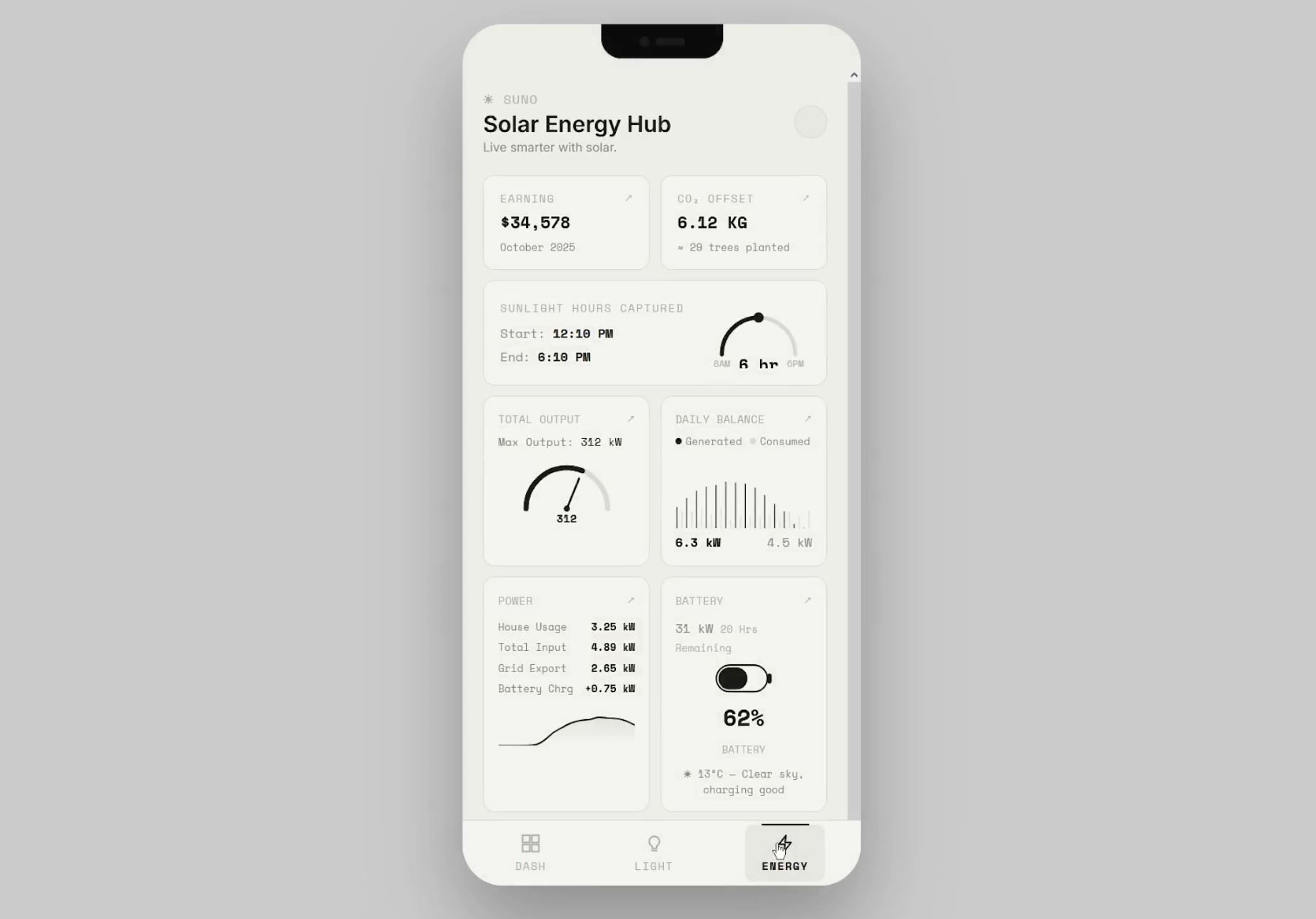 A mobile-first IoT dashboard prototype built in React with Framer Motion and Recharts.